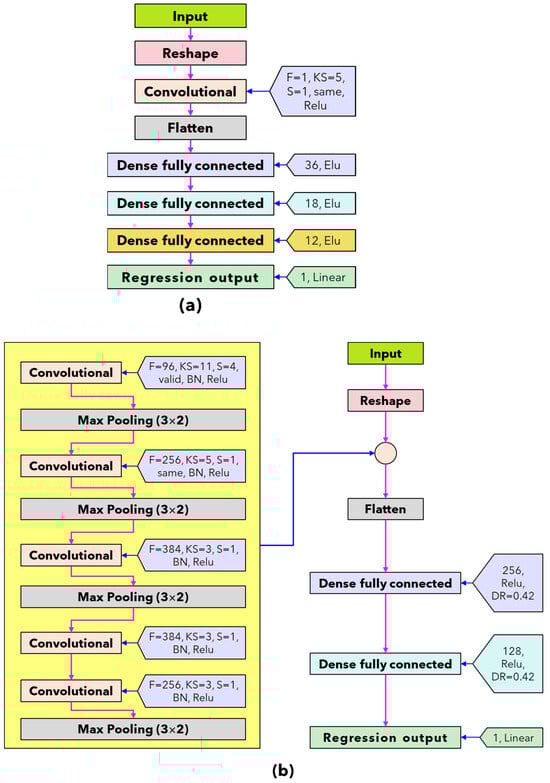 All types of network architecture model deep-learning training procedures in this study were performed using Adam optimizer. In the simple CNN network architecture (Figure 2a), the number of batches, epochs per running, validation split, and learning rate are 128, 1000, 10%, and 5 × 10−3, respectively. In the S-AlexNET network architecture (Figure 2b), the number of batches, epoch per running, validation split, and learning rate are 16, 300, 10%, and 10−5, respectively. In the ResNET network architecture (Figure 2c), the number of batches, epochs per running, validation split, and learning rate are 160, 1000, 10%, and 10−5, respectively. In the GoogleNET network architecture (Figure 2d), the number of batches, epochs per running, validation split, and learning rate are 160, 1000, 10%, and 10−5, respectively. The total running time is 11 times with early stopping patience of 200 epochs for simple CNN, ResNET, and GoogleNET and 300 epochs for S-AlexNET. All network architectures use random split validation at the training stage with 10% from the training dataset (10% × 315 = 32) with a random state 42. After that, the best deep-learning regression was evaluated with a testing dataset of as much as 135.