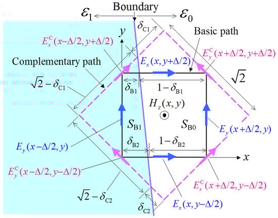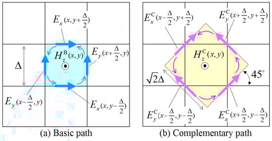 First, let us review the concept of the PI model for the NS-FDTD method [,,]. The model uses both basic and complementary paths, as depicted in Figure 1, for the evaluation of the magnetic-field component. Herein, we intend to establish a complementary relation between these two paths. The idea is based on the wave propagation characteristics of the Yee algorithm [,,], where maximum and minimum errors occur at an angle of on a square lattice. This indicates that we can mutually cancel these errors by means of two meshes for one node calculation. In an effort to attain the optimal cancellation of the inevitable discretization errors, the complementary (C) path is rotated with respect to the basic (B) one. Specifically, the two integral paths are expressed as