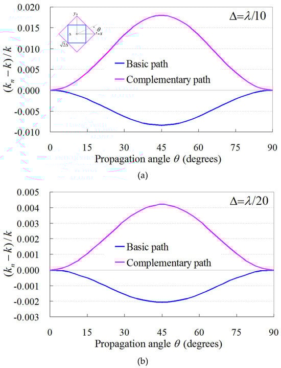 for the complementary path (Figure 1b). Note that in (1) and (2), we have replaced with the nonstandard correction function , where k is the physical wavenumber [,]. Based on this substitution, the propagation accuracy, , of the basic and complementary path model is shown in Figure 2 for two lattice resolutions and , representing the numerical wavenumber of the proposed PI model. The results are obtained via the method presented in [,], and as can be promptly observed, both models exhibit opposite propagation errors for the desired mutual cancellation. In this manner, the new PI model is derived by means of