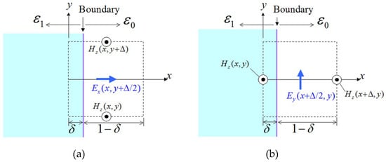 with a similar formula holding for the temporal derivative. In addition, the components on the complementary path can be extracted through the inner products of these components with the respective unit vector . Notice that (8)–(13) are the best models, derived theoretically and numerically from the previous analysis. Finally, as a supplement, a special case of the right-angle edge can be treated by (i) selecting the width, so that the edge fits on the grid, (ii) moving the edge to the grid line, so that it fits on, and (iii) applying the modified PI models of Figure 4 and Figure 5.