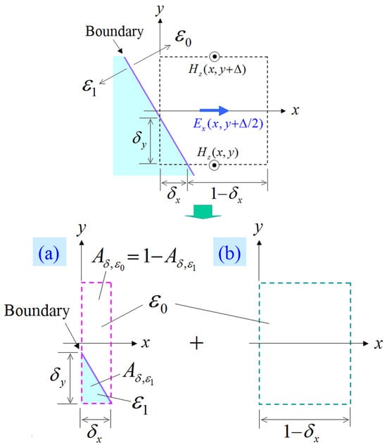 On the other hand, when the case of an obliquely aligned, with respect to the lattice, dielectric boundary is taken into account, we introduce the cell division scheme of Figure 5, where is the occupied area ratio. Explicitly, Figure 5a is considered as the parallel case of Figure 4b, while the entire model in Figure 5a,b is treated as the normal case of Figure 4a. Hence, the corresponding can be expressed as