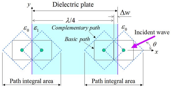 where with as the wavenumber of the dielectric medium, are the areas occupied by the dielectric medium inside the basic path, and are path lengths along the basic path in the medium. Also, the notation refers to the component in the dielectric medium. Note that if is not available at a specific node on the grid, we use the extrapolation values at the nearest-neighbor node; for example, . Similarly, the term using the complementary path in Figure 3 is given by