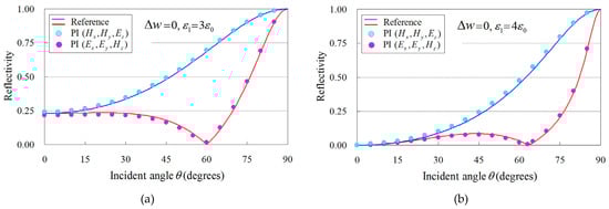 In order to substantiate the merits of the featured PI model, we focus on the reflectivity analysis of a flat dielectric plate as a basic example with an analytic solution. The computational domain is shown in Figure 6, whereas the PI models of (5)–(13) are employed only on the dielectric surface. Moreover, the plate is infinite along the directions, and an incident plane wave impinges from the right side in Figure 6. Therefore, the sine–cosine method [] is used for our oblique incidence calculations. For our ( and ) analysis, we examine two dielectric media, namely, an acrylic resin with and a glass epoxy with . The remaining implementation aspects are: λ = 1 m, , and , with T as the corresponding wave period, while open-space truncation is conducted in terms of a -thick perfectly matched layer (PML) []. To facilitate our comparisons, we use, as our reference, the analytical solution of the specific problem described in []. In this context, Figure 7 illustrates the reflectivity of the flat dielectric plate for the aforementioned materials and two configurations, i.e., (the right-hand side of the plate surface is aligned to the grid) and (the plate surface is not aligned to the grid). As observed, all the outcomes derived via the enhanced PI models are in promising agreement with the reference solution, thus proving the competence of the new scheme to effectively treat arbitrary dielectric boundaries. In this case, the flat plate model can be treated accurately for a geometrical integral path length and occupied ratio in the cell since the dielectric boundary is straight and parallel to the grid line (y-axis). Hence, we can detect that the PI model closely follows the analytic solution if we utilize an exact path length and occupied ratio in the PI cell. This fact proves the validity of the proposed PI model in the analysis of arbitrary dielectric boundaries.