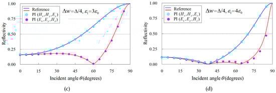 Reflectivity ( and ) analysis versus the incidence angle, , for the flat dielectric plate of Figure 6, performed in terms of the proposed PI model and compared to the analytical (reference) solution of []. The analysis involves two dielectric media (acrylic resin and glass epoxy) in conjunction with two arrangements (: the right-hand side of the plate surface is aligned to the grid and : the plate surface is not aligned to the grid). (a) Acrylic resin with and , (b) glass epoxy with and , (c) acrylic resin with and , and (d) glass epoxy with and .
