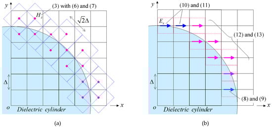 Probing further, we proceed to a more realistic application and compute the RCS of an infinite dielectric cylinder with a radius of and a relative permittivity of . For the curved boundary, we utilize the oblique dielectric models of Figure 5, formulated in (6)–(13). The grid layout is given in Figure 8, where the novel PI model is applied only on the cylinder surface and the rest of the domain is a regular NS-FDTD region. In particular, Figure 8a depicts the PI model of the component, expressed via (3), (6), and (7), while Figure 8b presents the PI model for the component, described by (8)–(13). This configuration is attributed to the occupation ratio of the dielectrics and the direction of the electric field in the shaded (cyan) cells. Note that the treatment of the component is the same as the one, owing to the rotational symmetry of the problem. Furthermore, for the excitation of the structure through an incident plane wave (impinging with an angle of ) and the evaluation of the scattered waves from the dielectric cylinder, the total-field/scattered-field formulation [] is employed. Finally, the scattered waves, so obtained, are converted to the appropriate RCS data by means of the near-to-far-field transformation technique [,].