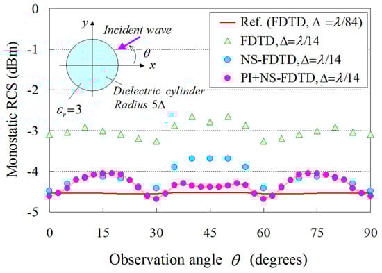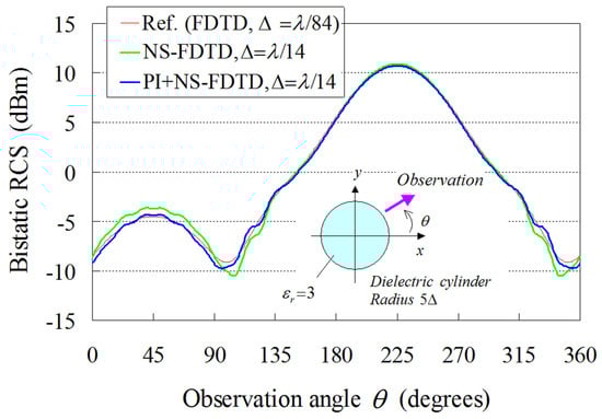 Bistatic RCS results derived from the proposed (PI+NS-FDTD) technique and the NS-FDTD algorithm without the PI model. The reference solution is acquired from an FDTD realization with a very fine (, ) lattice resolution. The incidence angle of the impinging plane wave is , while the geometric PI cell data of the cylinder are depicted in Figure 8.