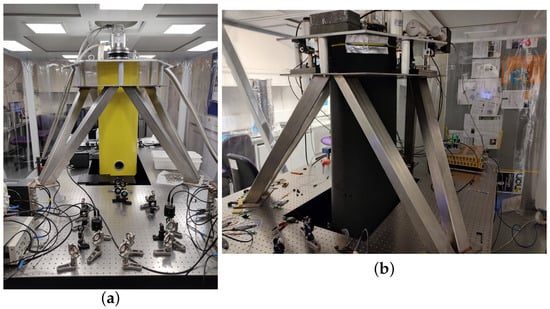 Panel (a) shows the experimental set-up in an earlier iteration without active seismic isolation of the cryostat. This image shows the key optical and electronic components, as well as the exposed vacuum lid showing the location of the viewports. Panel (b) shows the same experiment in its current status. The parallel plates near the top of the cryostat support an array of seismometers, coil–magnet actuators, passive rubber springs and counterweights. In this image, many electronic components are moved and the cryostat lid is wrapped in soft foam, thus obscuring most of the viewport’s aperture. These latter changes are implemented to address acoustic noise that we discovered coupled into some areas of the detection band.