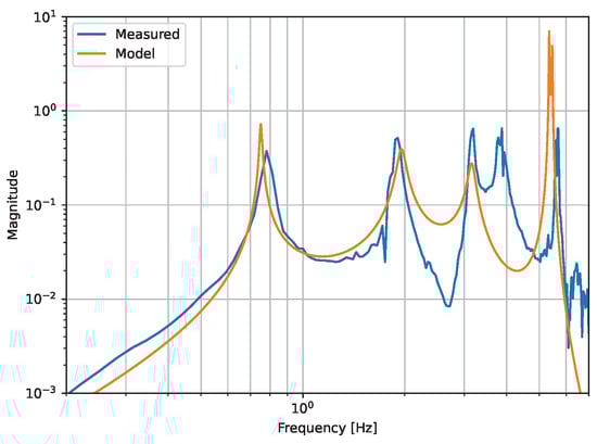 Transfer function of the suspension-point motion to the differential cavity motion. The Lagrangian model uses independently obtained values for the suspension parameters and only contains one free parameter (aside from the Q of the resonances), which is the unknown mismatch between the wire stiffness of the two final mirror stages. The model can be further improved by constraining the clamping losses and other damping mechanisms to better predict the resonance Q factors, and by including the coupling between the two separate cavities (the current model only considers a single cavity) which would likely allow for us to explain the zero in the transfer function at 2.7 Hz. The modeled transfer function is shifted vertically to line up with the measured data for visual clarity. The true gain of the transfer function is determined using parameters that are difficult to measure independently and is thus unknown. However, the location of the resonances and the overall shape of the transfer function is independent of the overall gain, and these match the measured data with reasonable accuracy. The unknown resonance at approximately 3.8 Hz is thought to be a pitch resonance that is cross-coupled to the the longitudinal mirror displacement.