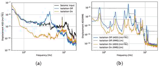 Panel (a) shows the performance of the active seismic isolation as seen by the geophones in the X DoF. The isolation off trace clearly shows the presence of the horizontal resonance of the rubber supports at 3.9 Hz and the passive suppression effect that is generated above this frequency. The isolation on trace shows an order-of-magnitude level of suppression compared to the input seismic motion and significant improvement over the passive-only effect in the region below 8 Hz. The isolation on trace inherits the passive isolation of the rubber springs above 8 Hz. Panel (b) shows the suppression of the seismic noise by the active isolation as witnessed by the cavity control signal. The RMS curves show the cumulative RMS integrated from high to low frequencies. The comparison of the isolation on/off curves shows a consistent reduction in the displacement spectrum with that measured by the in-loop geophones in Figure 4a. Importantly, the cavity sees an order-of-magnitude drop in its RMS motion when the active isolation in engaged.