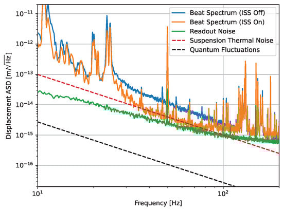 We show the amplitude spectral density of the beat between the reflected fields from the two cavities in Figure 5. The spectrum is shown in two configurations: one with intensity stabilization servo (ISS) off and one with ISS engaged. In the simplified treatment of the interferometric system, intensity fluctuations couple into the phase-sensitive beat readout as a second-order effect. However, the light cavity mirrors lead to a large mechanical admittance to the classical radiation pressure fluctuations caused by the intensity noise. We show that the suppression of this effect leads to an improvement by up to a factor of five in the frequency band from 30 Hz to 100 Hz.