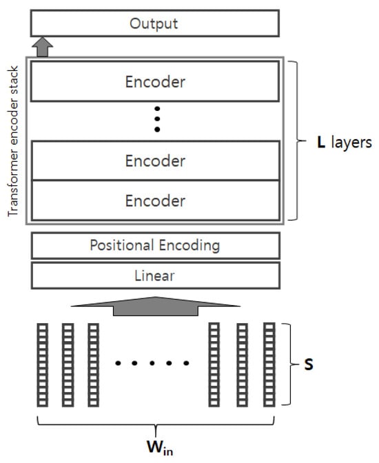 Figure 2 depicts the structure of our encoder-based model. The model takes a sequence of S-dimensional vectors as an input, and the S-dimensional vectors are firstly mapped to another h-dimensional representation space through the linear layer. Note that is the input matrix in the Equation (1), where the is the input window size; please refer to Figure 1 for an example of window size. The positional encoding (PE) of the Transformer is applied to the vectors, and they are passed to the stack of encoders. If we regard the PE as a function, then it takes a position index as an input and generates a real-number vector that represents the positional information. The generated real-number vector (i.e., position vector) usually takes the same shape of the input embedding vectors; in this paper, the position vector will be the h-dimensional vector so that it can be combined with the h-dimensional embedding vector generated by the linear layer through arbitrary function (e.g., element-wise addition). The PE allows it to consider the positional information of the sensor values so that it grasps the sequential patterns of the sequence. The Transformer encoder has a ‘multi-head self-attention’ mechanism, where the self-attention analyzes pair-wise relations between any pairs of a given sequence, and the multi-head enables it to analyze various types of relations. Suppose the encoder takes h-dimensional vector as an input, then the encoder generates the h-dimensional vector as an output. This allows a stacked encoder architecture. The number of encoder layers L depends on the task complexity. The left-most representation generated from the last encoder layer is finally delivered to the output layer for the prediction. The output layer dimension depends on the number of classes. The output layer can be followed by a Softmax function for multi-class classification. The model structure is basically similar to the original Transformer encoder. The major difference is that our model takes the real-number feature vectors, so it does not have any embedding layer (i.e., look-up table) and just linearly converts the vectors into h-dimensional vectors. That is, the embedding layer of original Transformer takes tokens (i.e., categorical values) as input, whereas our model takes sensor values (i.e., numerical values) as input, and the linear layer projects the sensor values into the h-dimensional space. Another difference is that our model is designed for the classification task, so it has the output layer on top of the encoder stack.