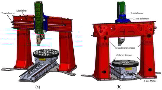 Figure 3 presents a detailed 3D model of the machine, highlighting the integration of key internal temperature sensors as installed by the manufacturer. Additionally, it showcases the strategic placement of four external temperature sensors embedded within the machine’s structure. These supplementary sensors significantly enhance the collection of thermal data throughout the measurement process, enriching the thermal information gathered during the measurements.