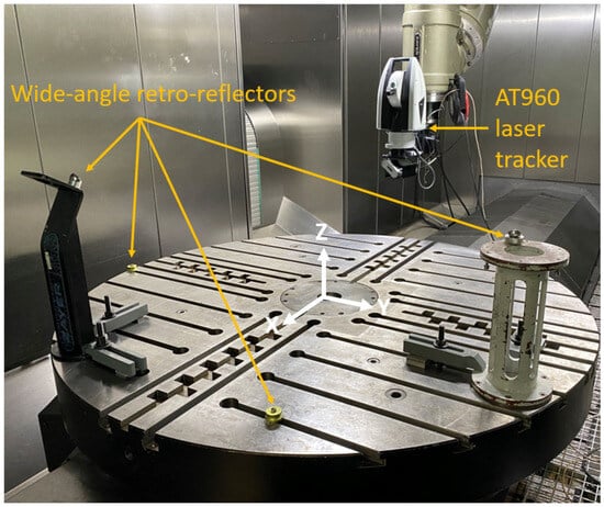 On the software front, the automation and management of the entire measurement process are facilitated using Spatial Analyzer (SA™) software (https://www.kinematics.com/spatialanalyzer/, accessed on 22 February 2024). The Unified Spatial Metrology Network (USMN) algorithm is employed instead of a pure multilateration approach [21]. This choice enables the development of tailored measurement solutions, exemplified in the case of the MIIM technique. Customised software has been devised to enable continuous and fully autonomous MIIM measurements on the MT spanning several days or months. This strategic integration of advanced hardware and software components underscores the comprehensive and innovative nature of the MIIM method in addressing the intricate challenges posed by thermal characterisation in the realm of machine tools.
