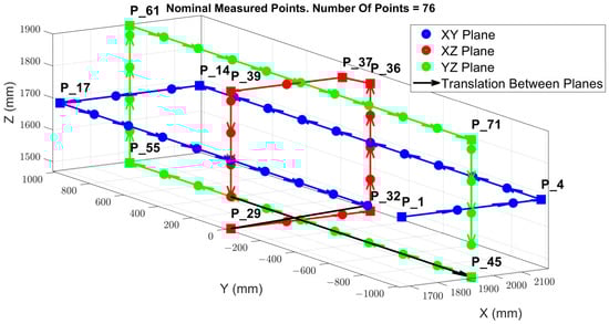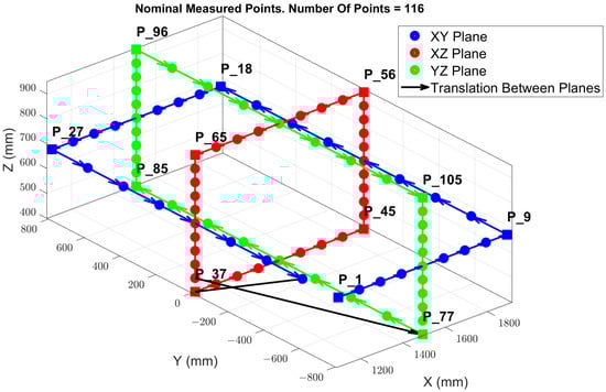 Figure 6 illustrates the arrangement of the point cloud configuration and the TCP locations, which are evenly distributed across the XY, XZ, and YZ planes, strategically positioned within the mid-range of each axis. This specific configuration of points is designed to streamline the process of inverse kinematics (IK), facilitating the resolution of the MT kinematic parameters that enable a potential volumetric correction. During the measurement phase, the table remains stationary, with no rotational movement; it undergoes only translational movements along the X, Y, and Z axes. Starting from point P1, the machine sequentially progresses to the subsequent point until it reaches the last point, completing a full cycle of measurements. Following this, the machine returns to point P1 to commence a new set of measurements.