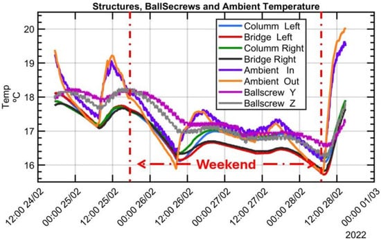 The graphical analysis indicates that the measured temperatures provide evidence of how all recorded temperatures, with a certain delay, mirror the ambient temperature. Variations in slopes and amplitudes are attributed to distinct heat transfer conditions and thermal inertia at each sensor location. It shows that temperatures at various MT structural components, like columns and the bridge, closely follow the ambient air temperature. Additionally, temperature readings from the ballscrews installed on the linear axes, despite the linear positioning movements required to reach each measurement point, show no significant increase, reinforcing the conclusion that ambient temperature variations comprise the sole thermal load affecting the MT during the MIIM process.