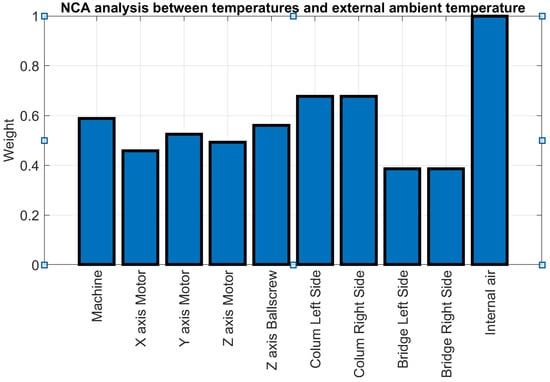 For a thermal error analysis of the MT, an array of temperature sensors was strategically deployed to meticulously monitor both the structural integrity of the MT and its critical components prone to heat generation. In addition to the existing sensors on the machine, six additional sensors were integrated alongside the machine’s pre-existing sensor suite. Specifically, two of these sensors were dedicated to monitoring ambient temperature: one measured the air temperature inside the working enclosure, and the other assessed the external air temperature outside it.