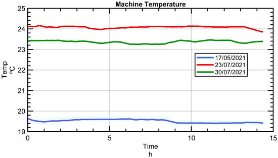 As noted earlier, the workshop setting for this study was not subjected to artificial climate control, thereby situating the experimental research within in an uncontrolled thermal environment characterised by a fluctuating amplitude and frequency of thermal cycles. This decision was deliberate and aimed to capture the essence of real-world conditions. To this end, experimental tests were strategically scheduled during intervals forecasted to exhibit substantial daily temperature variations over several days. This carefully chosen timing guaranteed that the measurements accurately mirror actual operating conditions, thus significantly boosting the practicality and pertinence of the novel MIIM method under investigation for real-world MT applications.