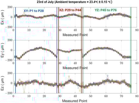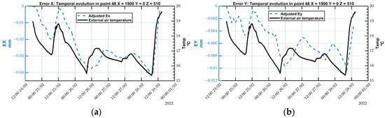 A key benefit of the MIIM method lies in its ability to track changes in measured point deviations over time. Figure 16 demonstrates the evolution of ETVE error in both X and Y directions at a specific point within the measurement point cloud. There is a clear correlation between temporal fluctuations in point deviation and changes in ambient temperature. Thus, given that ambient temperature is the sole source of thermal variations, the ETVE error accurately reflects the deviation at each measured point.