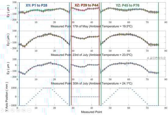 Similarly, the error along the Y-axis, Ey, follows a pattern that corresponds to ambient temperature changes. Despite theoretical predictions suggesting no variation error due to the MT’s symmetry, EY displays a variation of less than −10 µm in response to a total temperature decrease of −3.5 °C. This deviation, which is four times smaller than that observed in the X-axis, indicates that the MT does not deform symmetrically. This lack of symmetry may be attributed to the Y-slide nut’s location, which differs from that of the linear encoder measuring head.