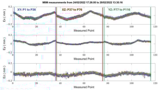 Throughout the duration of the experimental test, the MIIM test was performed autonomously. For this experiment, a measurement point cloud of 116 points was established to enhance the resolution and facilitate the subsequent interpretation of MT thermal distortion, despite an extended measurement time of approximately one hour. Figure 15 illustrates deviations at each of the 116 measured points (refer to Figure 6) across 73 MIIM measurements conducted in February 2022, revealing that the peak absolute geometric error for the MT was ±0.16 mm at the time of the test campaign. Geometric deviations along the X, Y, and Z axes are represented as Ex, Ey, and Ez, respectively. Table 6 summarises the average and maximum standard deviation values recorded for the X, Y, and Z axes during the MIIM test campaign in February. The variability in ambient temperature likely contributed to the less optimal values compared to those obtained under more stable MT conditions. The fluctuations in ambient temperature are likely responsible for the less favourable results compared to those achieved under the quasi-stationary MT condition.
