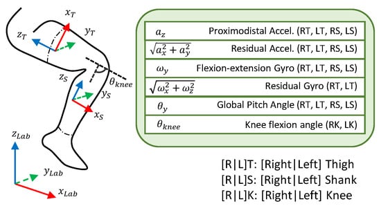 Similarly, the angular velocity was decomposed into two components: the angular velocity about the axis of flexion, and the residual component that is perpendicular to the axis of flexion. The angular velocity about the flexion axis and the magnitude of the orthogonal residual component were used as two additional inputs to the model. It is worth mentioning that the residual component of the angular velocity of the shank, which is orthogonal to the knee flexion angular velocity, was found to be noisy. Therefore, only the residual angular velocity from the thigh IMUs were used (see Figure 2).