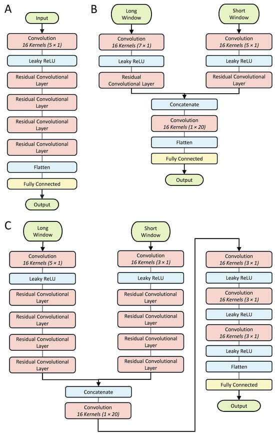Three different model architectures were compared to determine whether the multi-rate architecture and the deep layer architecture are justifiable. The first model is a single-rate estimator that only uses data sampled from the long window, shown in Figure 5A. The second model (Figure 5B) is a shallow dual-rate estimator that only uses 1 layer of residual blocks for each of the input windows. Figure 5C shows the last model, which is also a dual-rate model, but uses 4 residual layers per input window, as well as 2 convolutional layers after the concatenation. These models are referred to as the Single Head-4, Dual Head-1, and Dual Head-4 according to their input format and number of residual layers.