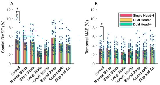 (A) The spatial and (B) temporal performance of the models in one-section-out cross-validation when each walking condition is left out. Comparisons with significantly different average errors using a level of significance of 0.05 are denoted by an asterisk.