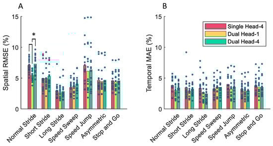 For spatial error, the KS test showed that there was a significant difference in performance when leaving out the normal stride walking conditions for the Single Head-1 and Dual Head-4 models. On the contrary, there was no significant increase in temporal error compared to training on all of the data when leaving out each of the seven walking conditions separately.
