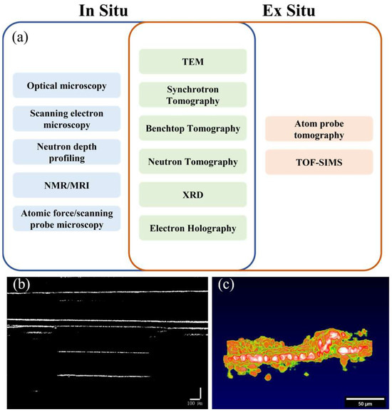 (a) In situ and ex situ monitoring methods for solid-state batteries [5,6,7,8,9,10,11,12,13,14,15,16,17,18,19,20], (b) two-dimensional image of battery interface, (c) two-dimensional side view image of battery interface.