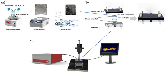 The preparation of solid electrolyte can be divided into four steps, as shown in Figure 2a. Firstly, the solid electrolyte used in the solid-state battery was a polymer electrolyte. The main materials used were polyvinylidene fluoride-hexafluoropropylene copolymer (PVDF-HFP) and lithium salt, lithium bis (trifluoromethane sulfonyl) imide (LiC2F6NO4S2) (mass ratio: PVDF-HFP:LiC2F6NO4S2 = 1:1.5). Secondly, the electrolyte material was dissolved in a mixed solution of 1:3 volume ratio of N, N-dimethylformamide (DMF) and acetone (CH3COCH3) and stirred with a magnetic stirrer until the electrolyte was completely dissolved into the mixed solution. Thirdly, the solution of the electrolyte material was evenly poured into a petri dish, and then placed on a heating plate, heated to 70 °C for 2 h to solidify the electrolyte. Finally, the solidified electrolyte was cut with a puncher to match the shape of the electrode (area = 1.9 cm2). The thickness of the lithium metal electrode is 5 μm (China Energy Lithium Company, Tianjin, China). The thickness of the solid electrolyte is 40 μm.