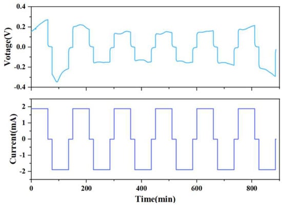 In order to observe the change of the internal solid interface during the charging and discharging process of the battery, the current is set at 1.9 mA, the deposition time is 1 h, the interval is 15 min, and the alarm voltage is at ±3 V. From Figure 4, it can be seen that in the first five cycles, although the I-V curve of the solid-state battery fluctuates slightly, the overall shape is relatively uniform and has a battlement pattern, indicating that the charge–discharge cycle process of the battery is relatively stable.