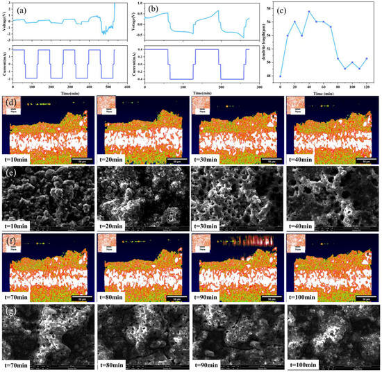 Solid-state battery test results: (a) 1.9 mA constant current test, (b) 0.4 mA constant current test, (c) dendrite growth state diagram, (d) OCT images of variation trend of dendrites in the stage of battery charging, (e) SEM images of variation trend of dendrites in the stage of battery charging, (f) OCT images of variation trend of dendrites in the stage of battery discharging, (g) SEM images of variation trend of dendrites in the stage of battery discharging.