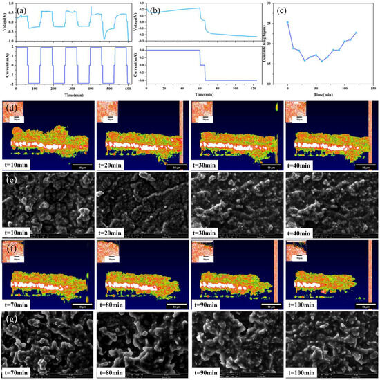 Solid-state battery test results: (a) 1.9 mA constant current test, (b) 0.4 mA constant current test, (c) dendrite growth state diagram, (d) OCT images of variation trend of dendrite in the stage of battery charging, (e) SEM images of variation trend of dendrite in the stage of battery charging, (f) OCT images of variation trend of dendrite in the stage of battery discharging, (g) SEM images of variation trend of dendrite in the stage of battery discharging.