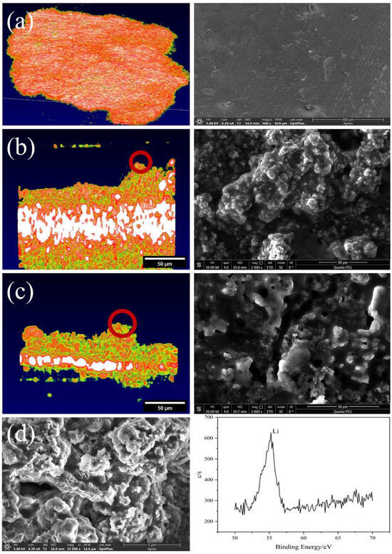 Characterization of solid-state batteries: (a) the OCT and SEM of the lithium metal electrode in its initial state, (b) OCT and SEM images showing dendrite formation after charging Battery 1, (c) OCT and SEM images showing dendrite formation after charging Battery 2, (d) SEM and XPS characterization of lithium dendrites.