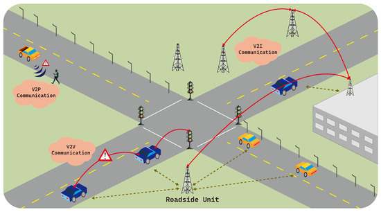 An illustration of smart city with intelligent transportation systems highlighting the communication-related core components, i.e., V2X communication and roadside units.