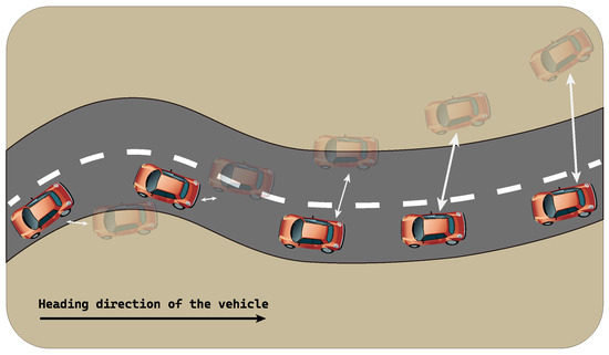 An illustrative description of the proposed algorithm is shown in Figure 4. The car in the figure is assumed to be moving to the right, and the assumed task is to predict the third and fourth position of the car. As it can be seen in Figure 4a, the first prediction (denoted by a transparent car image) is slightly deviated from the actual location (denoted by a solid car image. However, due to the error in the first prediction, the second prediction is further away from the ground truth, causing error accumulation. Figure 4b,c sequentially show the proposed link projection. When the prediction has been made by the proposed SAT model, the link projection is invoked and it tries to project the predicted location onto the link geometry (i.e., the actual road) with the shortest distance. Such a post-processing method shifts the predicted location to the on-road position, and thus the prediction error can be minimized while correctly placing the prediction on the actual road. Also, the reduced error of the first prediction reduces the error in the following predictions as can be seen at Figure 4c.