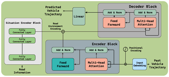 The goal of the proposed trajectory prediction model is to make realistic and precise vehicle trajectory prediction with a specific emphasis on minimizing multi-step prediction errors and capturing the user’s driving pattern changes caused by the various elements of the traffic system installed on the roads. The proposed model, called SAT, is an enhanced Transformer model, particularly designed to achieve the goal. The proposed design of the model is visualized in Figure 3, consisting of the following blocks.