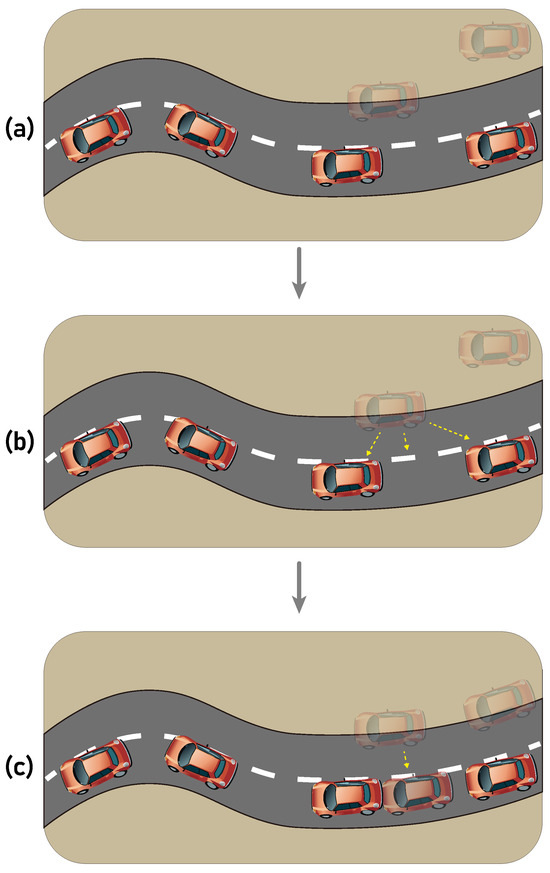 An example scenario illustrating the link projection method we propose to prevent error accumulation and to prevent off-road prediction. In the subfigures (a–c), transparent and solid objects represent the predicted and ground truth locations of a vehicle, respectively. The subfigures (a–c) in sequence demonstrate the operation and advantage of the proposed link projection.