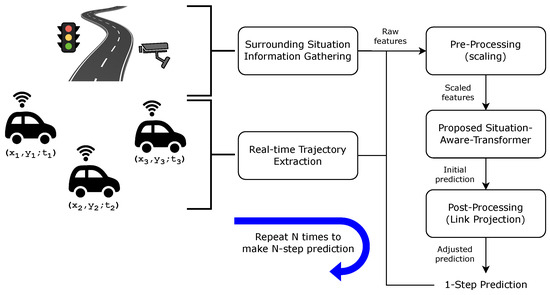 Figure 5 illustrates the overall procedure of the proposed approach. After gathering the information which is the concatenation of the number of past trajectory data points and the extracted situation information, the min-max scaling operation is carried out on the input data during pre-processing. The processed information is then passed to the SAT to make an accurate prediction on the future trajectory data points. To further enhance the prediction accuracy while guaranteeing the on-road prediction, link projection is carried out as a post-processing method. The procedure is repeated N times to generate N data points as a future trajectory.