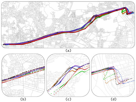 Figure 7 depicts the location of the actual vehicle (i.e., ground truth) and the predicted ones in a single figure. In addition to the aforementioned evaluation metrics, i.e., RMSE, MAE and ABC, the figure visually shows if the predicted trajectory is laid on the actual road. This visualization serves to highlight the limitations of the evaluation methods by demonstrating the effectiveness of the proposed approach in trajectory prediction and its practical applicability in real-world scenarios. Figure 7a illustrates the entire trajectory of the ground truth on the map, and the individual trajectories produced by the considered models. Although it is difficult to differentiate one trajectory from the rest, it can be seen from the figure that the Vanilla Transformer (red) and ConvLSTM (green) deviate significantly from the ground truth (black) in the middle portion of the trajectory. Also, at the end of the trajectory, both 1D-CNN (orange) and ConvLSTM (green) differ markedly from the ground truth. Those two segments on the trajectory have relatively complex road structure and have many traffic control devices along with intersection and bus stops. Due to such high complexity, some models have yielded low accuracy in prediction.