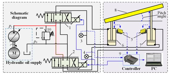 Drilling tool attitude adjustment system principle with electrohydraulic proportional control. Notes: 1,2—electrohydraulic proportional directional valve; 3,4—pressure sensor; 5—displacement sensor; 6—rear lifting hydraulic cylinder; 7—front lifting hydraulic cylinder; 8—simplified model of the DTAAS; 9—controller; 10—safety relief valve.