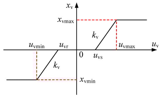 where xvmin, xvmax represent the lower and upper limit values, respectively; kv represent the valve amplification coefficient; uvr, uvs represent the threshold values for entering and leaving the dead zone, respectively, which determine the width of the dead zone. Additionally, Equation (8) can be rewritten as Equation (10).