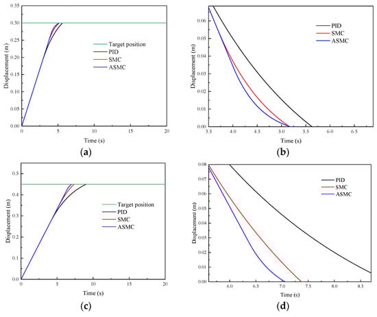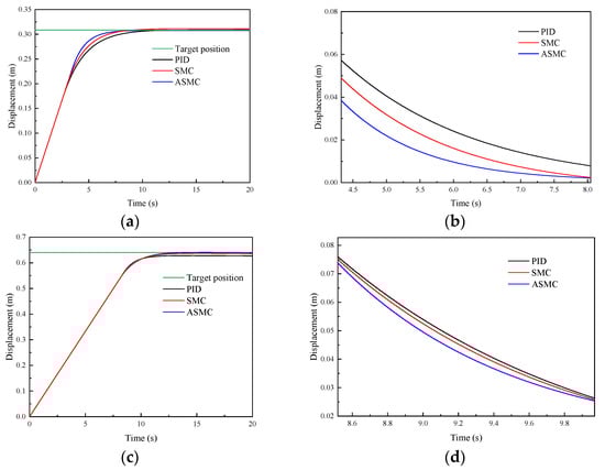 Comparative simulation results of the PID, SMC and ASMC methods in tracking step signal: (a) Simulation results of the front lifting hydraulic cylinder with different methods; (b) Simulation results of the position-tracking error for the front lifting hydraulic cylinder; (c) Simulation results of the rear lifting hydraulic cylinder with different methods; (d) Simulation results of the position-tracking error for the rear lifting hydraulic cylinder.