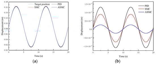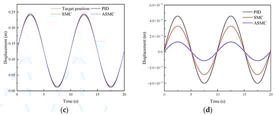 Afterward, Figure 6 shows the comparative simulation results of different methods in tracking sinusoidal signals. Figure 6a shows that the SMC has a better time response characteristic than the PID, and no significant difference compared with the ASMC. Figure 6b shows that the SMC controller is better than the PID controller in the position-tracking average absolute error (4.34 mm), the position-tracking average absolute error of the SMC is 2.68 mm. The position-tracking average absolute error of the ASMC is 2.06 mm, which is 52.53%, 23.13% less than the PID and SMC. For the rear lifting hydraulic cylinder, Figure 6c shows that the response times of the PID, SMC and ASMC are fast. Figure 6d shows that the SMC controller is better than the PID controller in the position-tracking average absolute error (6.27 mm), the position-tracking average absolute error of the SMC is 3.42 mm. The position-tracking average absolute error of the ASMC is 2.63 mm, which is 58.05%, 23.09% less than the PID and SMC. From these results, the ASMC has better system response characteristics when position-tracking control under the step and sinusoidal signals.