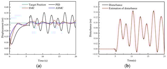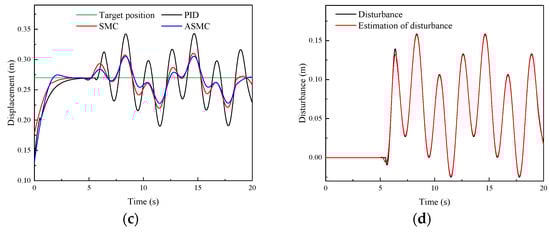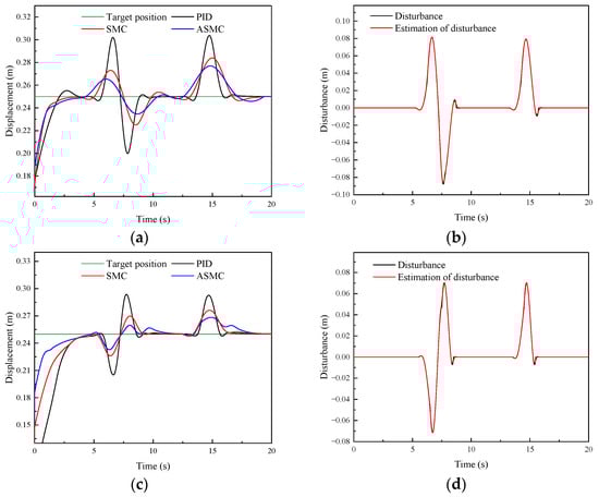 To verify the anti-disturbance performance of the proposed ASMC method for the DTAAS, Figure 10 shows the comparative experimental results of position tracking of the PID, SMC and ASMC methods under a given target position signal and adding a position disturbance. Figure 10a shows the response characteristics curve of the PID, SMC and ASMC, and the settling time is 4.29 s, 3.73 s, and 3.61 s, respectively. The position-tracking maximum absolute error of the SMC is 33.87 mm. With the PID, the maximum absolute error is 53.54 mm. Additionally, the position-tracking maximum absolute error of the ASMC is 26.95 mm, which is 49.66%, 20.43% less than the PID and SMC. Figure 10c shows that the settling time and the maximum absolute error of the PID are 4.23 s, 43.57 mm, respectively, which is inferior to the 3.81 s, 26.18 mm of the SMC. Then, the settling time and the maximum absolute error of the ASMC are 3.79 s, 18.36 mm, respectively, which are 57.86%, 29.87% less than the PID and SMC in suppressing the disturbance. Furthermore, Figure 10b,d show that the ASMC can effectively observe the disturbance and compensate for the position-tracking control. Therefore, it can be indicated that the proposed ASMC has stronger anti-disturbance than the PID and SMC, which can effectively enhance the anti-disturbance capability of the DTAAS.