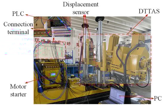 The physical prototype is constructed to validate the designed controller for the DTAAS, and the experimental platform is shown in Figure 8. The designed controller was conducted using PLC 1511C included displacement sensor information acquisition, electrohydraulic proportional directional valve signal output, control method processing, and the continuous sampling frequency of the position-tracking loop is 1 kHz. To further study the practicability and effectiveness of the designed controller for the DTAAS, including position-tracking and anti-disturbance, performance tests were carried out.