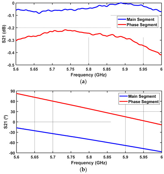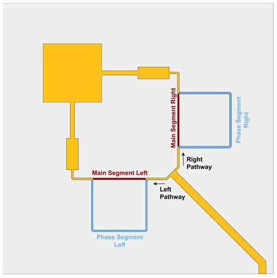 22]. Reconfigurability in this context refers to the ability to control at each moment which of the pathway lines will be active (Main or Phase), and, therefore, which polarization the antenna has at that moment. The blue line (Phase Segment) has an additional electrical length of λ/4 in comparison to the red line (Main Segment); therefore, the signal phase offset between the two segments corresponds to 90°.