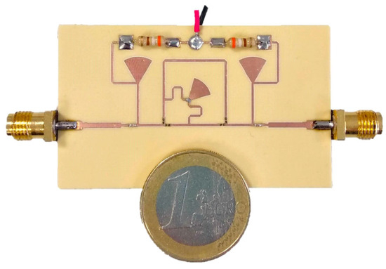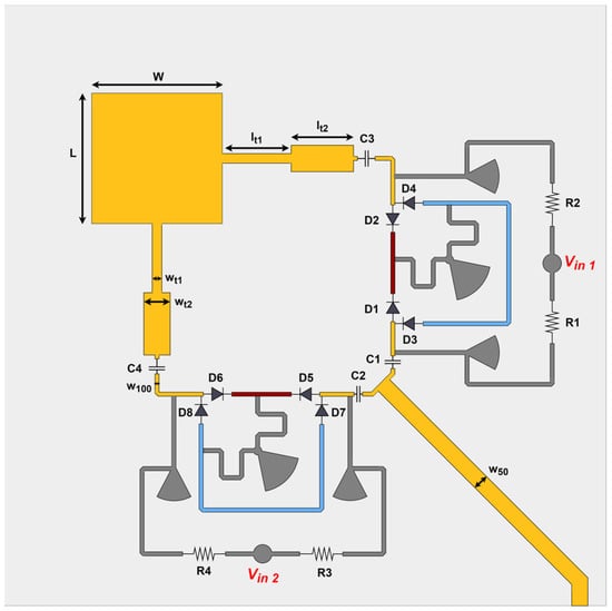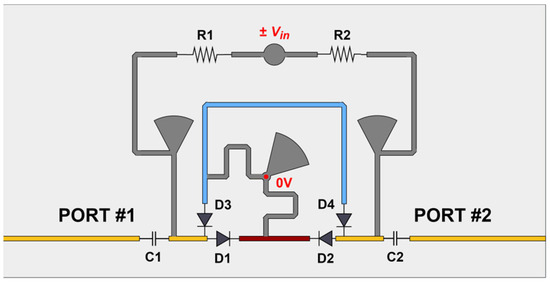 t of 0.045 pF. There is still a biasing circuit (Grey colour) that connects both segments to the ground (for signal), allowing the switching of the diodes to be conducted using a symmetric voltage ±Vin. Considering Vin = 4.8 V, two equal resistances R1 = R2 = 390 Ω were also added to the polarization circuit to balance the operation of the two diodes simultaneously and ensure a forward current of I
