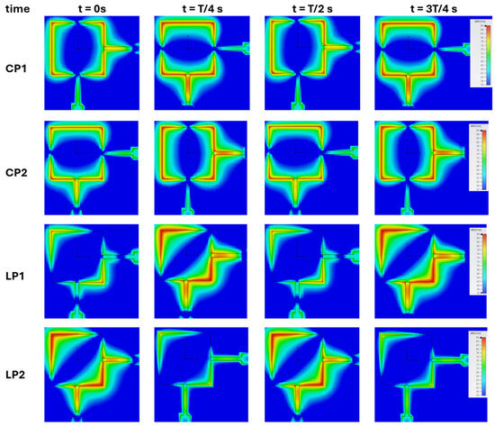 For the CP2 state, there are some similarities with the field figures from the CP1; however, with a time delay of T/4. These field distributions vary in time since the TM10 and TM01 modes are always excited simultaneously, as mentioned before. In the case of states LP1 and LP2, both orthogonal feeding signals are in phase, and it is possible to observe in both states, at each instant, that in the two points the maximums (and the minimums) coincide, generating a field distribution with a slope of 45°.
