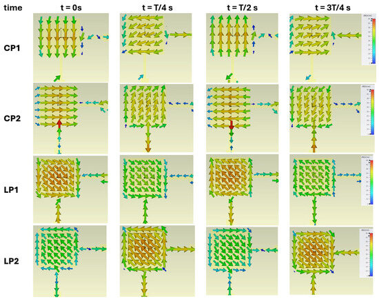 Figure 5, it is possible to see that in the case of the CP1 state, the direction of the currents rotates to the left side over time, proving that the polarization generated is left circular. In state CP2, the behaviour is similar, although in this case it is possible to observe that the direction of variation is opposite, and therefore, in this state, right circular polarization is generated. For the states LP1 and LP2, the surface current vectors vary with an inclination of 45°, demonstrating the generation of linear polarization.